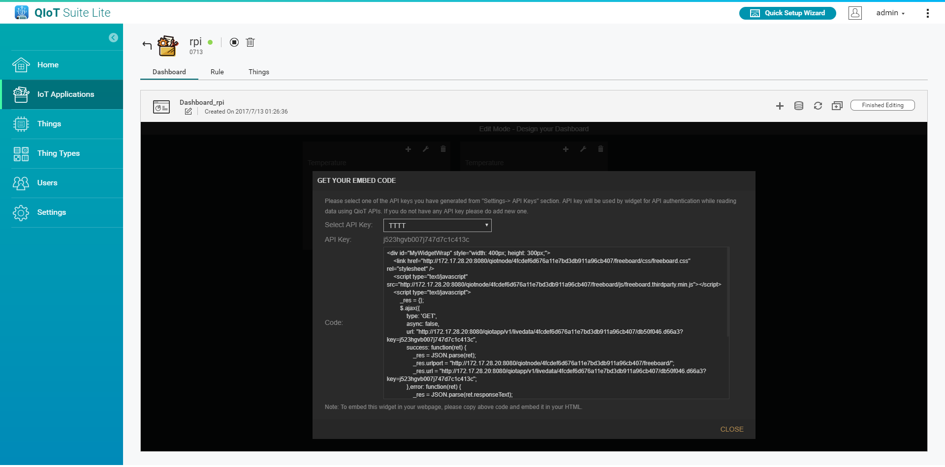 Select the API Key to generate the code below, the code can be embedded in a custom web page