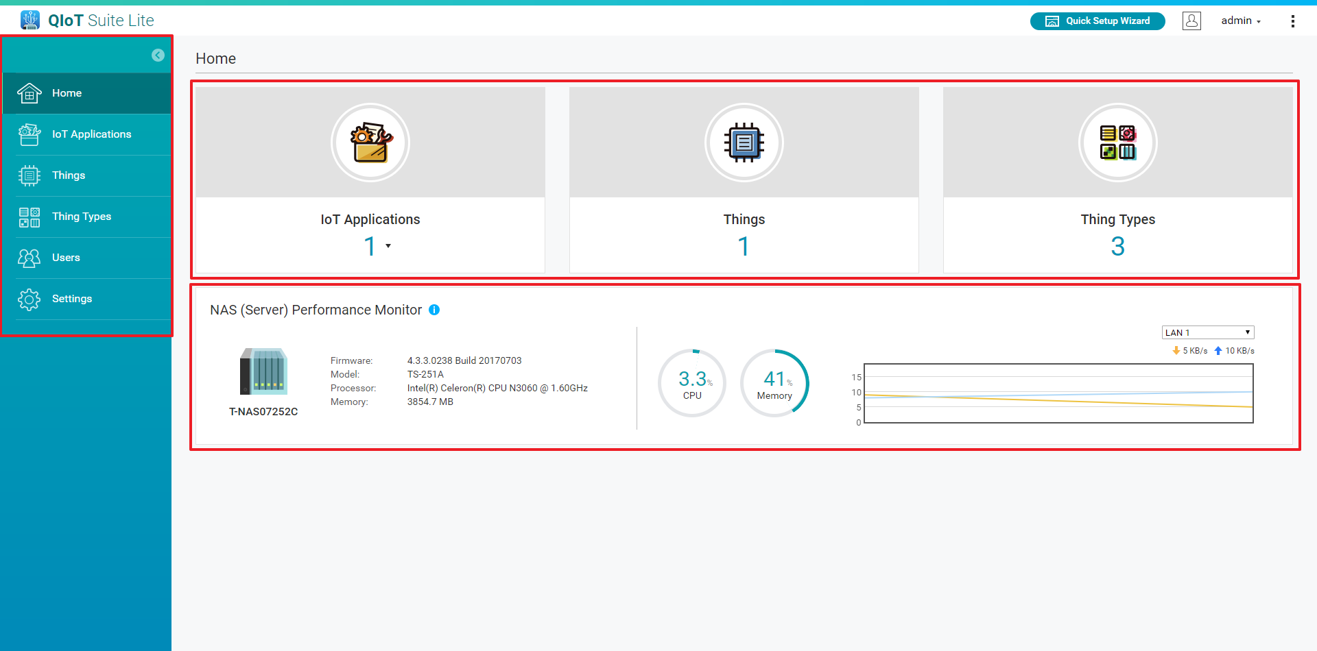 The top block provides IoT application, Things, Thing type link and the number of types created. The triangle next to the clickable IoT application icon shows the number of executions and stopped processes.