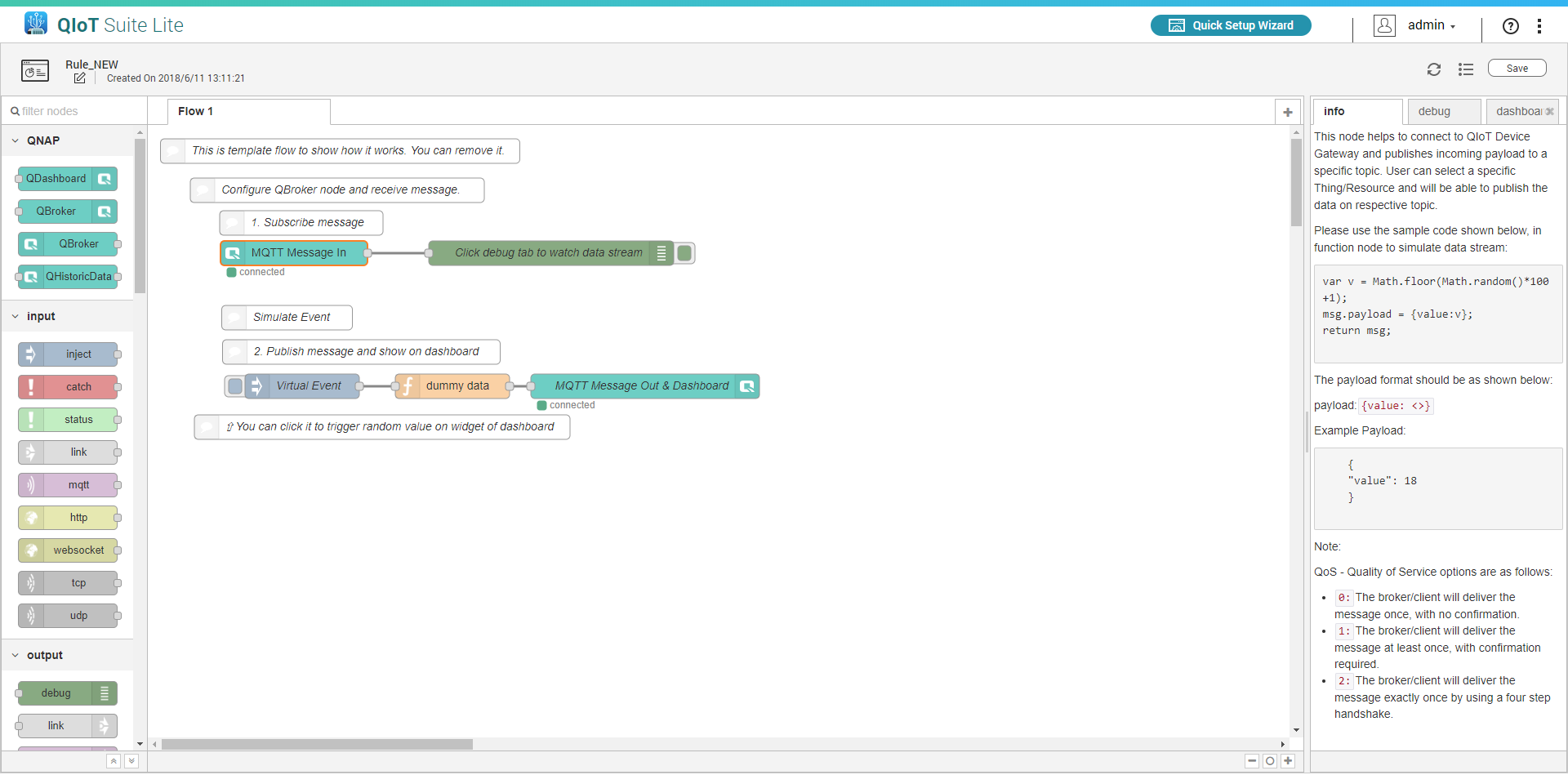There are 4 customized QIoT nodes: QDashboard, QBroker(in), QBroker(out) and QHistoricData.