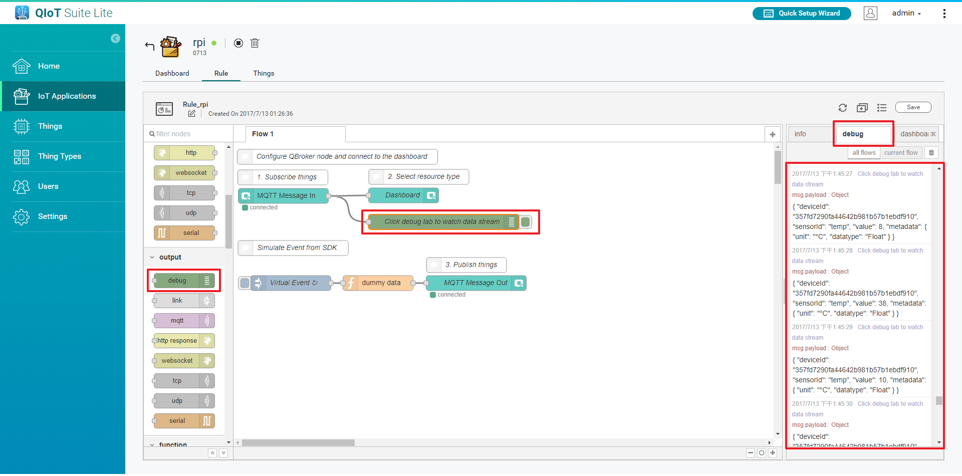 The Debug node and tab display all the messages and error messages encountered by the rule.