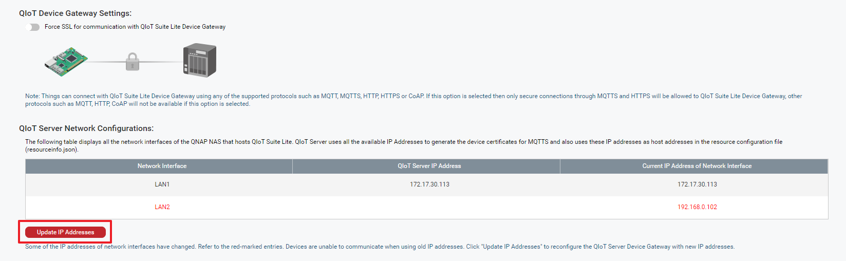 Server network configuration lists all QNAP NAS network Interface IPs of QIot Suite Lite. QIoT server uses all available IP addresses to generate device credentials for MQTTS, and also uses these IP addresses as host addresses in the connection file (resourceinfo.json). (If QNAP NAS changes IP, you must update to the new IP for QIoT connection)