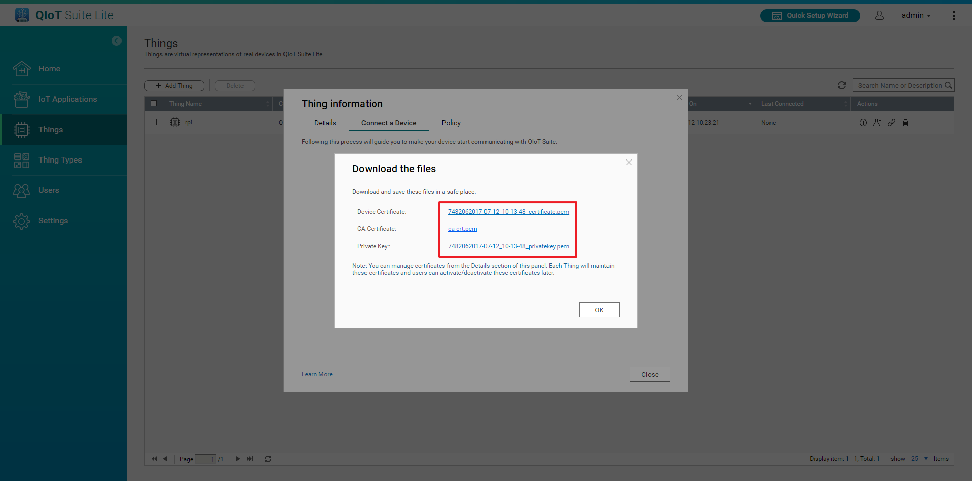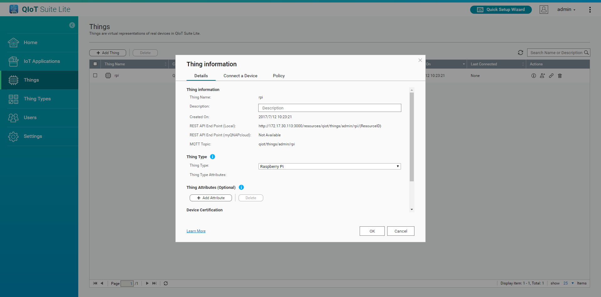 Thing details (various detailed information about the Thing) will be listed below: device credentials, connection profiles and Thing connection permissions management