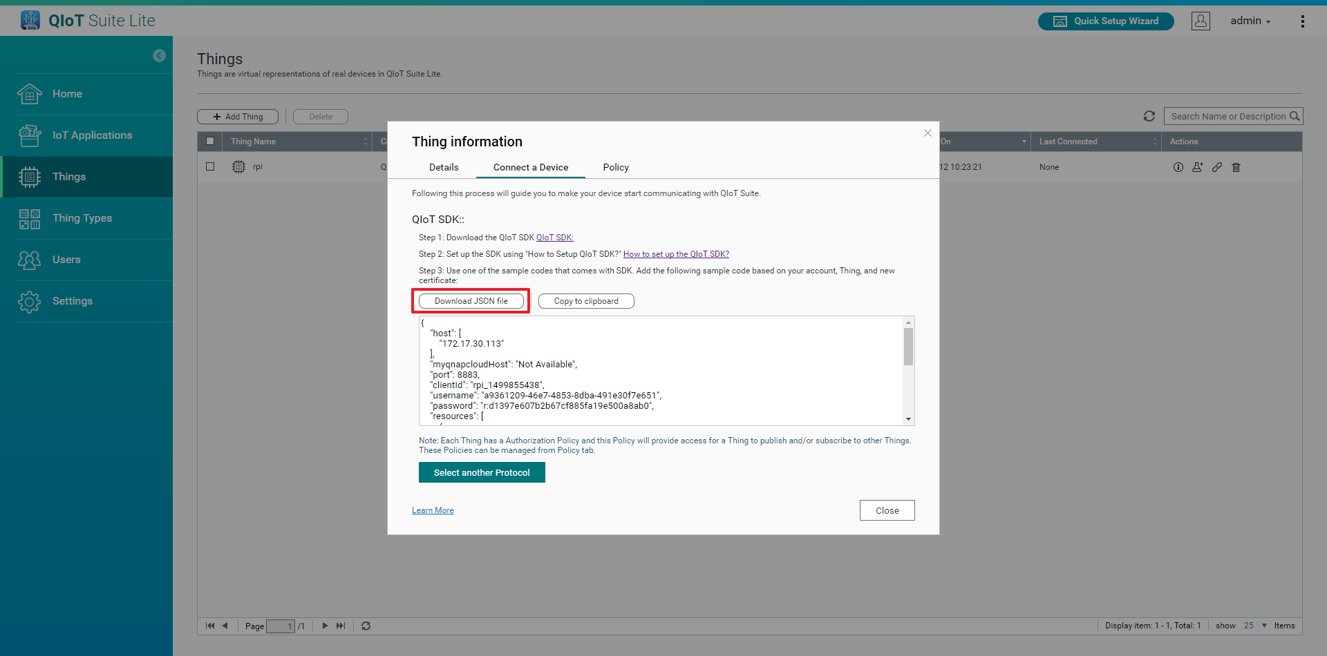 Click Download JSON file to download the connection file (resourceinfo.json) .