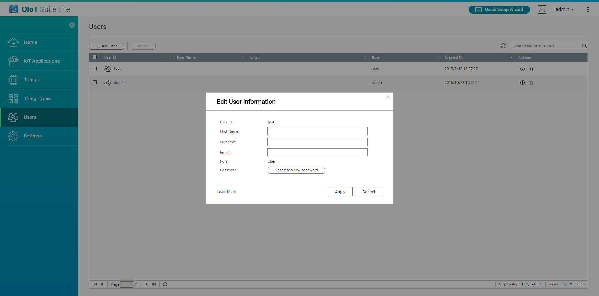 Edit user info. You can reset the name, last name, email address, and generated a new password if needed.